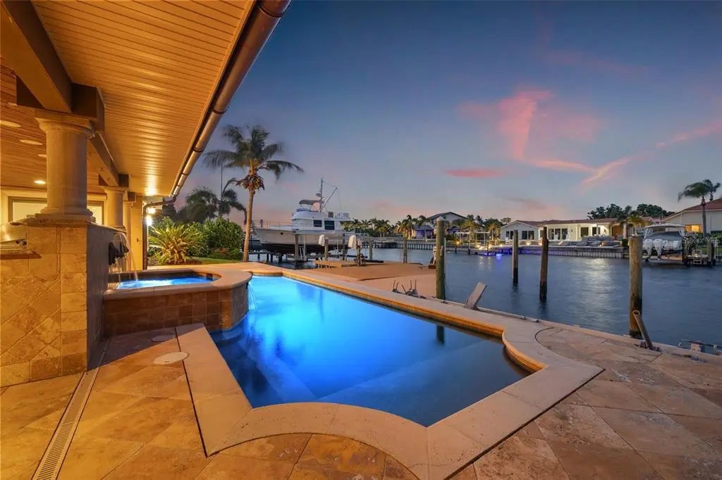 Step into a bright, open-concept living space thoughtfully updated with high-end finishes and modern, Mediterranean design. Enjoy seamless indoor-outdoor living with panoramic water views, a heated pool and spa, and a covered outdoor entertaining area complete with a built-in grill and refrigerator – perfect for hosting sunset gatherings.