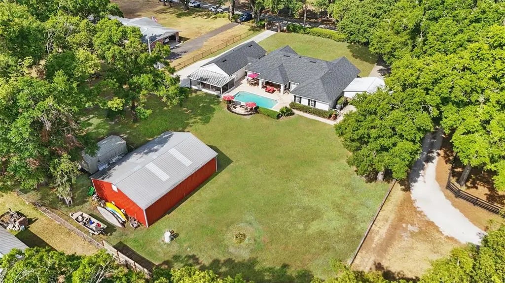 Under contract-accepting backup offers. REDUCED! LOCATION and UPDATES! Don't miss your opportunity to own this amazing homestead! Main house now has a NEW HVAC and NEW WATER HEATER plus WELL/WATER TEST completed for you. NEW ROOF's in 2020! Get your GATED HOMESTEAD life NOW with an ADU built in 2020, POOL, BARN, Situated on Approx. 1 ACRE - NO HOA/NO CDD! The main house offers 3 bedrooms, 2 bathrooms, a split floor plan, with pocket doors for guest privacy. Relax on your covered front and back porches. RV Carport and garage for the main house with its own gated driveway. ADU/BARN/WELDING shop/Workshop! POOL, Security Gates on a quiet, DEAD END PAVED road. Zoned agricultural and USDA eligible, bring your goats, chickens, pigs, or even donkeys—this property welcomes them all. Massive 30x40 steel barn/workshop features 110/220 amp service, an air-conditioned office, and ample space for use as a BARN, storage, for car enthusiasts, welding, or operating a home-based business. An additional 8x10 shed is great for storing lawn equipment, plus.